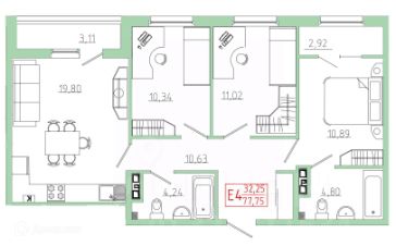 3 комн. квартира в ЖК Бульвар оптимистов, площадь 77.75 м², жилая 32.25 м², кухня 19.8 м²