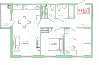 2 комн. квартира в ЖК Бульвар оптимистов, площадь 68.57 м², жилая 23.39 м², кухня 24.12 м²