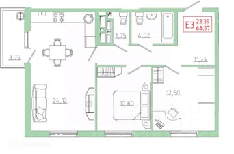 2 комн. квартира в ЖК Бульвар оптимистов, площадь 68.57 м², жилая 23.39 м², кухня 24.12 м²