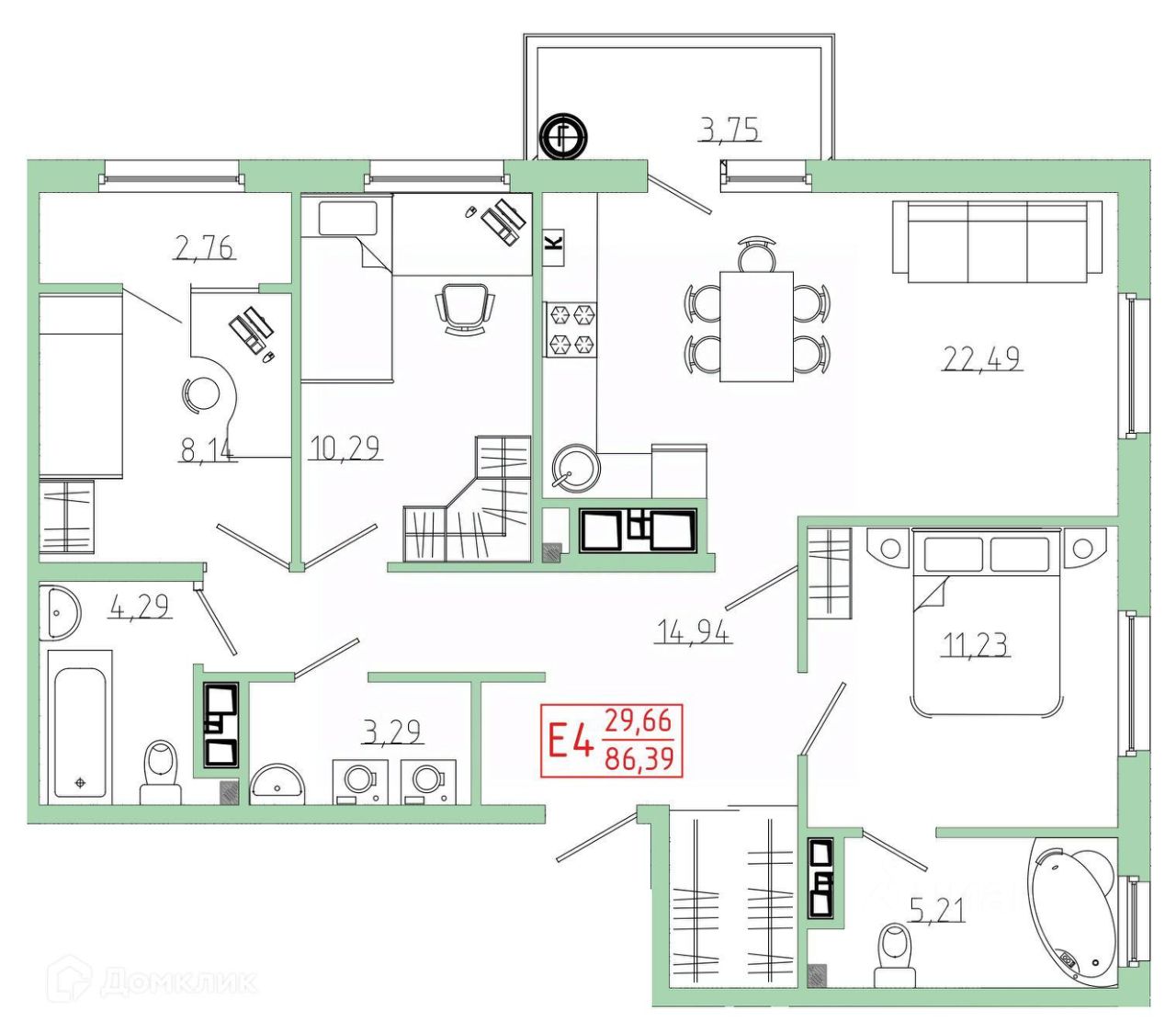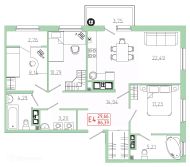 3 комн. квартира в ЖК Бульвар оптимистов, площадь 86.39 м², жилая 29.66 м², кухня 22.49 м²