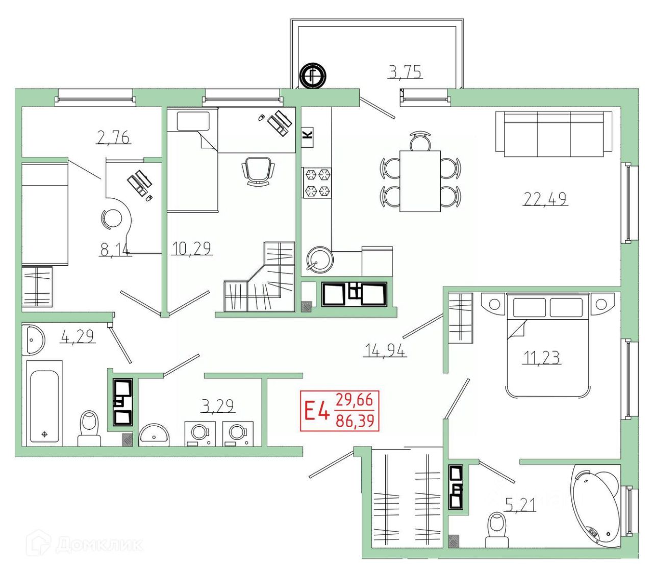 3 комн. квартира в ЖК Бульвар оптимистов, площадь 86.39 м², жилая 29.66 м², кухня 22.49 м²