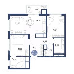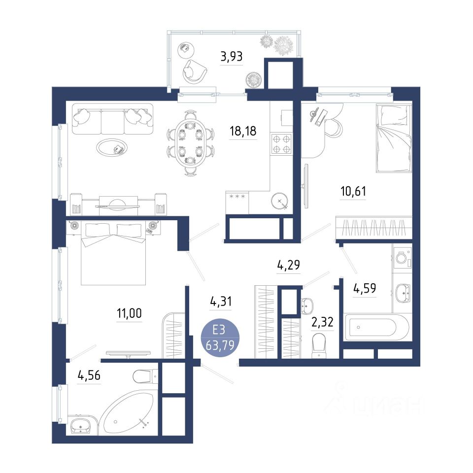 2 комн. квартира в ЖК Бульвар оптимистов, площадь 63.79 м², жилая 21.61 м², кухня 18.18 м²
