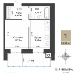 1 комн. квартира в ЖК Ривьера, площадь 36.92 м², жилая 11.25 м², кухня 9.61 м²