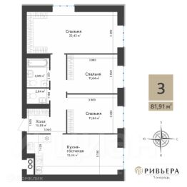 3 комн. квартира в ЖК Ривьера, площадь 82.19 м², жилая 45.71 м², кухня 19.44 м²