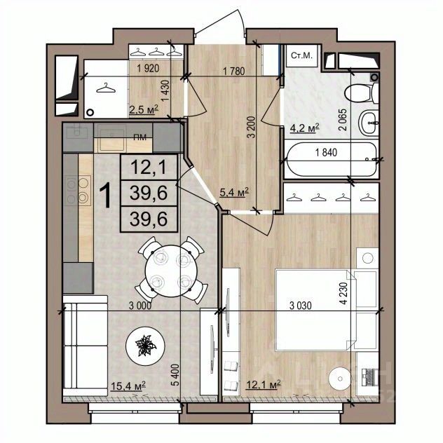 1 комн. квартира в ЖК Полярная Звезда, площадь 39.6 м², жилая 12.1 м², кухня 15.4 м²