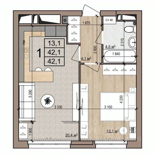 Общая площадь42,1 м²