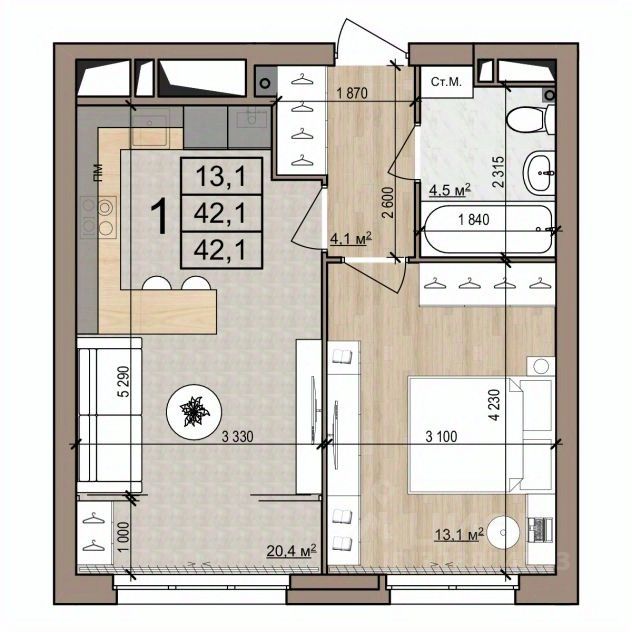 1 комн. квартира в ЖК Полярная Звезда, площадь 42.1 м², жилая 13.1 м², кухня 20.4 м²