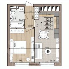 1 комн. квартира в ЖК Полярная Звезда, площадь 38.9 м², жилая 12.8 м², кухня 18 м²