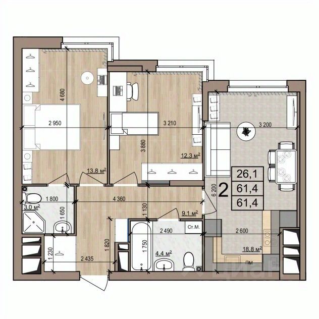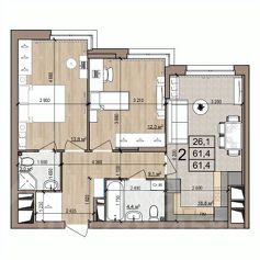 2 комн. квартира в ЖК Полярная Звезда, площадь 61.4 м², жилая 26.1 м², кухня 18.8 м²