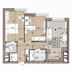 2 комн. квартира в ЖК Полярная Звезда, площадь 61.4 м², жилая 26.1 м², кухня 18.8 м²