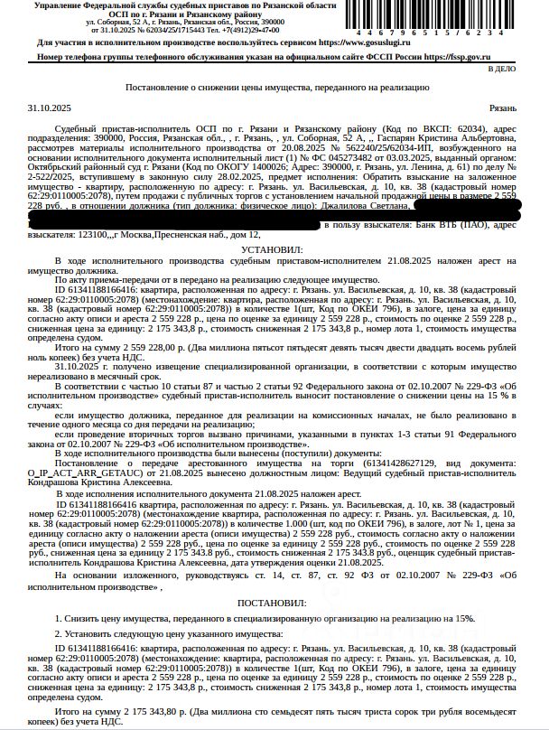 Помещение, назначение: жилое, наименование: квартира, площадь 52,5 кв.м, кадастровый номер 62:29:0110005:2078, местоположение: г.Рязань, Васильевская ул., д.10, кв.38. Согласно справке ООО "Р-Энергия" от 18.09.2025 г. по данному адресу зарегистрировано 3 человека, задолженность по взносам на капитальный ремонт составляет 16 943,09 руб. Залогодержатель: ПАО Банк ВТБ. Начальная цена: 2 175 343 (Два миллиона сто семьдесят пять тысяч триста сорок три) руб. 80 коп., без НДС. Задаток: 100 000 (Сто тысяч) руб. 00 коп. Шаг аукциона 1%: 21 753 (Двадцать одна тысяча семьсот пятьдесят три) руб. 44 коп.