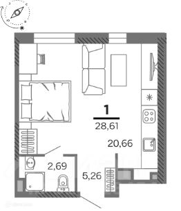 1 комн. квартира в ЖК город Рязань, Улица Зубковой, площадь 28.61 м², жилая 15.72 м², кухня 4.94 м²