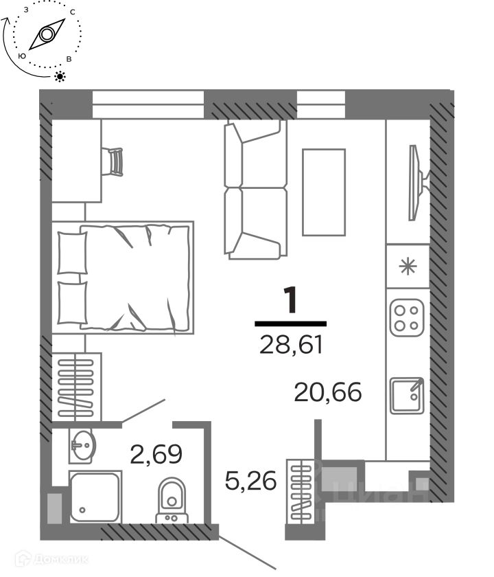 1 комн. квартира в ЖК город Рязань, Улица Зубковой, площадь 28.61 м², жилая 15.72 м², кухня 4.94 м²