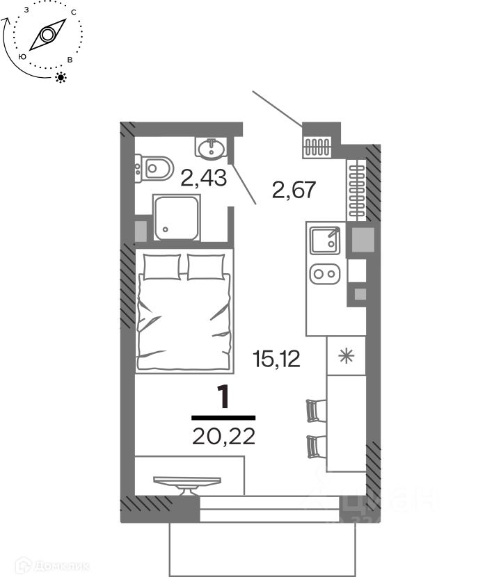 1 комн. квартира в ЖК город Рязань, Улица Зубковой, площадь 20.22 м², жилая 11.61 м², кухня 3.51 м²