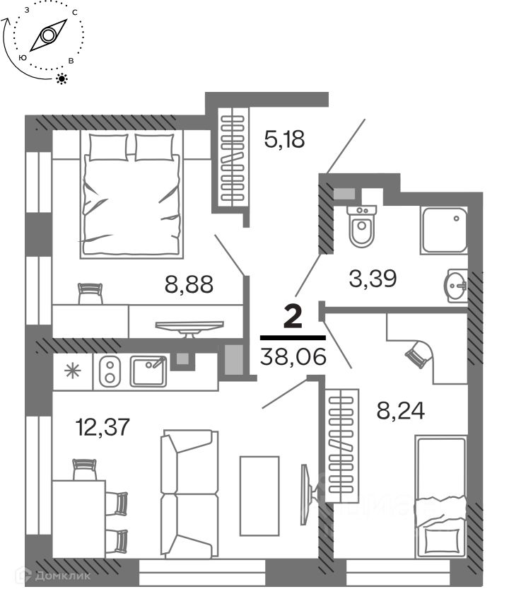 2 комн. квартира в ЖК город Рязань, Улица Зубковой, площадь 38.06 м², жилая 17.12 м², кухня 12.37 м²