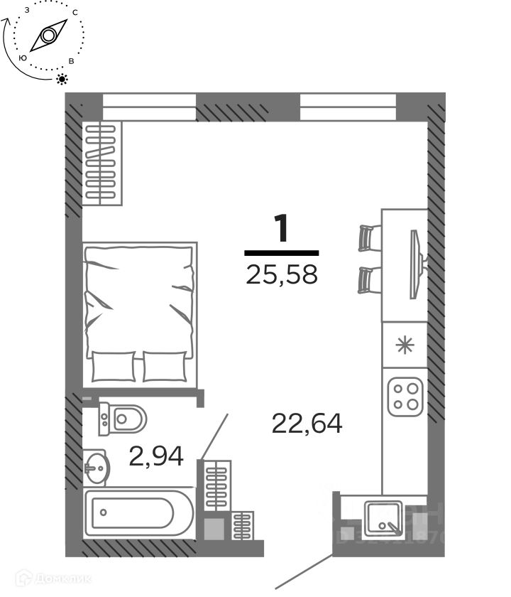 1 комн. квартира в ЖК город Рязань, Улица Зубковой, площадь 25.58 м², жилая 15.94 м², кухня 3.25 м²