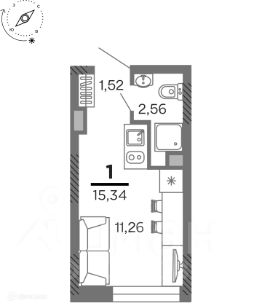 1 комн. квартира в ЖК город Рязань, Улица Зубковой, площадь 15.34 м², жилая 8.82 м², кухня 2.44 м²