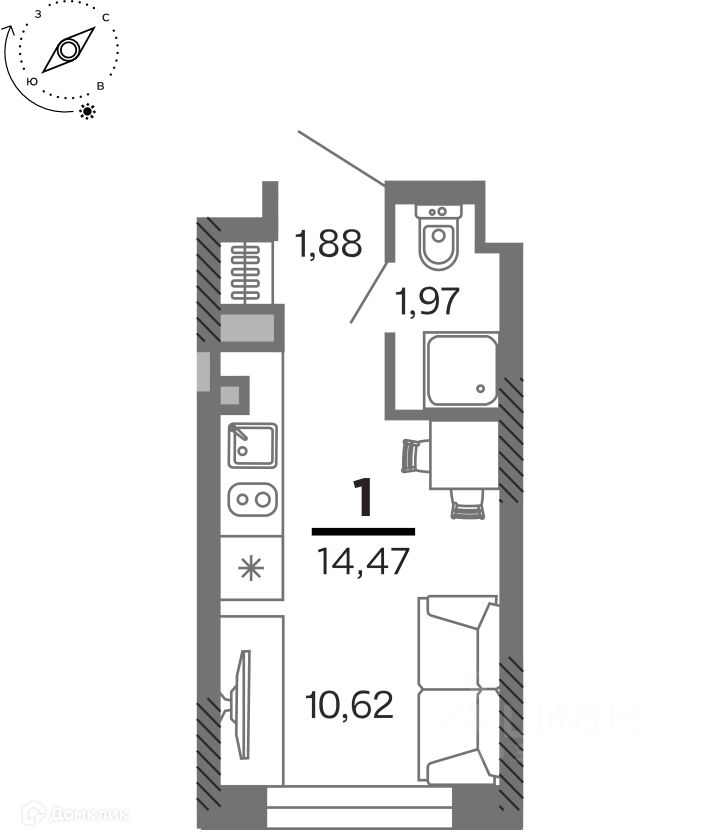 1 комн. квартира в ЖК город Рязань, Улица Зубковой, площадь 14.47 м², жилая 7.7 м², кухня 2.92 м²