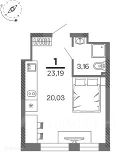 1 комн. квартира в ЖК город Рязань, Улица Зубковой, площадь 23.19 м², жилая 13.72 м², кухня 3.74 м²