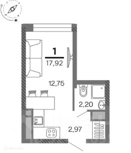1 комн. квартира в ЖК город Рязань, Улица Зубковой, площадь 17.92 м², жилая 9.19 м², кухня 3.56 м²