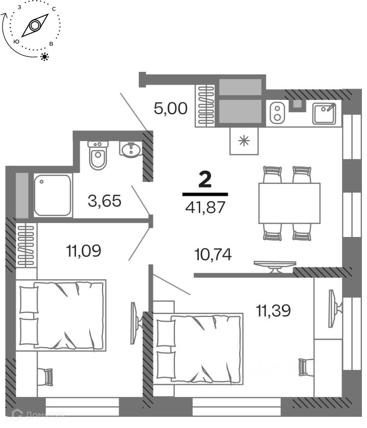 2 комн. квартира в ЖК город Рязань, Улица Зубковой, площадь 41.87 м², жилая 22.48 м², кухня 10.74 м²
