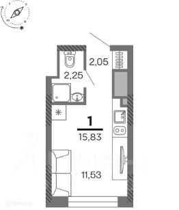 1 комн. квартира в ЖК город Рязань, Улица Зубковой, площадь 15.83 м², жилая 9.23 м², кухня 2.3 м²