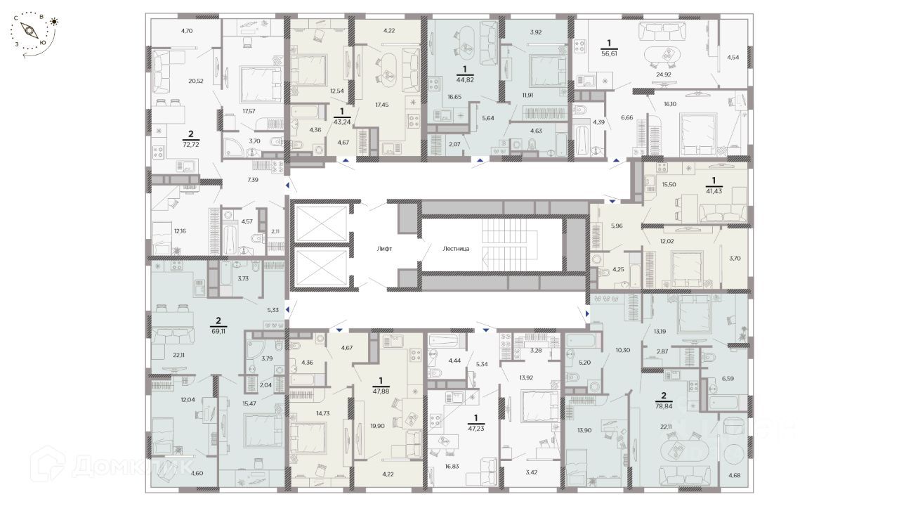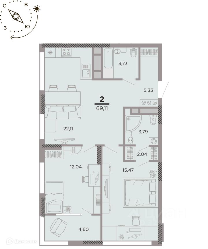 2 комн. квартира в ЖК Дом по Московское шоссе, площадь 69.11 м², жилая 27.51 м², кухня 22.11 м²