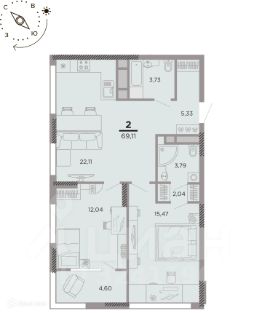 2 комн. квартира в ЖК Дом по Московское шоссе, площадь 69.11 м², жилая 27.51 м², кухня 22.11 м²