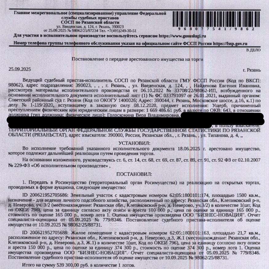 Помещение, назначение: жилое, наименование: помещение Ж1, к.н. 62:05:1800101:163, этаж 1, пл. 21,7 кв.м, местоп-е: Рязанская область, р-н Клепиковский, д Неверово, д 3, Ж1. Сведениями о зарег-х по данному адресу лицах, а также о задолж-и по взносам на кап.ремонт Организатор торгов не располагает. Вид огр-й (обрем-й): арест; Земельный участок, категория земель: земли населенных пунктов, ВРИ: для ведения личного подсобного хозяйства, к.н. 62:05:1800101:174, пл. 1500 +/- 14 кв.м, адрес: Рязанская область, Клепиковский МР, Уткинское сельское поселение, д. Неверово, уч.3/2. В пределах з/у расположен о.н. с к.н. 62:05:1800101:146, свед. о правообл. Организатор торгов не располагает. Взыскатель: ТО Федеральной службы государственной статистики по Рязанской обл (Рязаньстат). Начальная цена: 539 300 (Пятьсот тридцать девять тысяч триста) руб. 00 коп., без НДС. Задаток: 260 000 (Двести шестьдесят тысяч) руб. 00 коп. Шаг аукциона 1%: 5 393 (Пять тысяч триста девяносто три) руб. 00 коп.