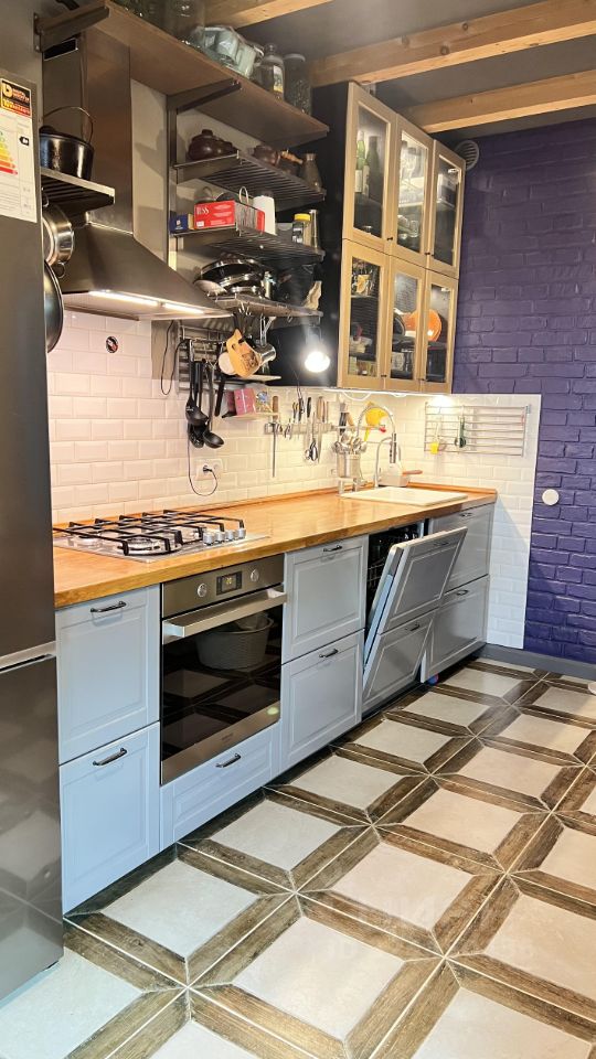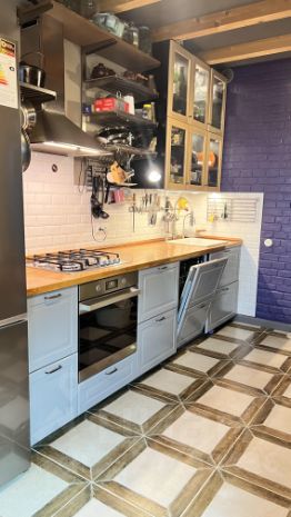 Просторная квартира с фактурным ремонтом в стиле лофт. Просторный коридор, большая кухня с выходом на балкон, раздельный санузел, одна из комнат с двумя окнами на юг и юго-восток. Индивидуальное отопление(котел Беретта, контуры дополнительно выведены на теплый пол на кухне и в ванной комнате).