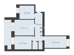 Квартира не угловая, комнаты изолированные просторные: 15,4 кв. м, 10,4 кв. м и 13,3 кв. м.