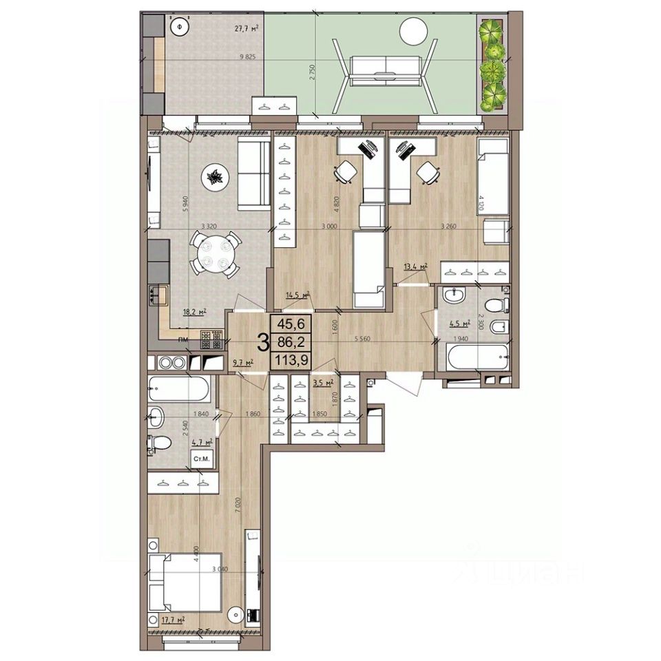 113,9 м²