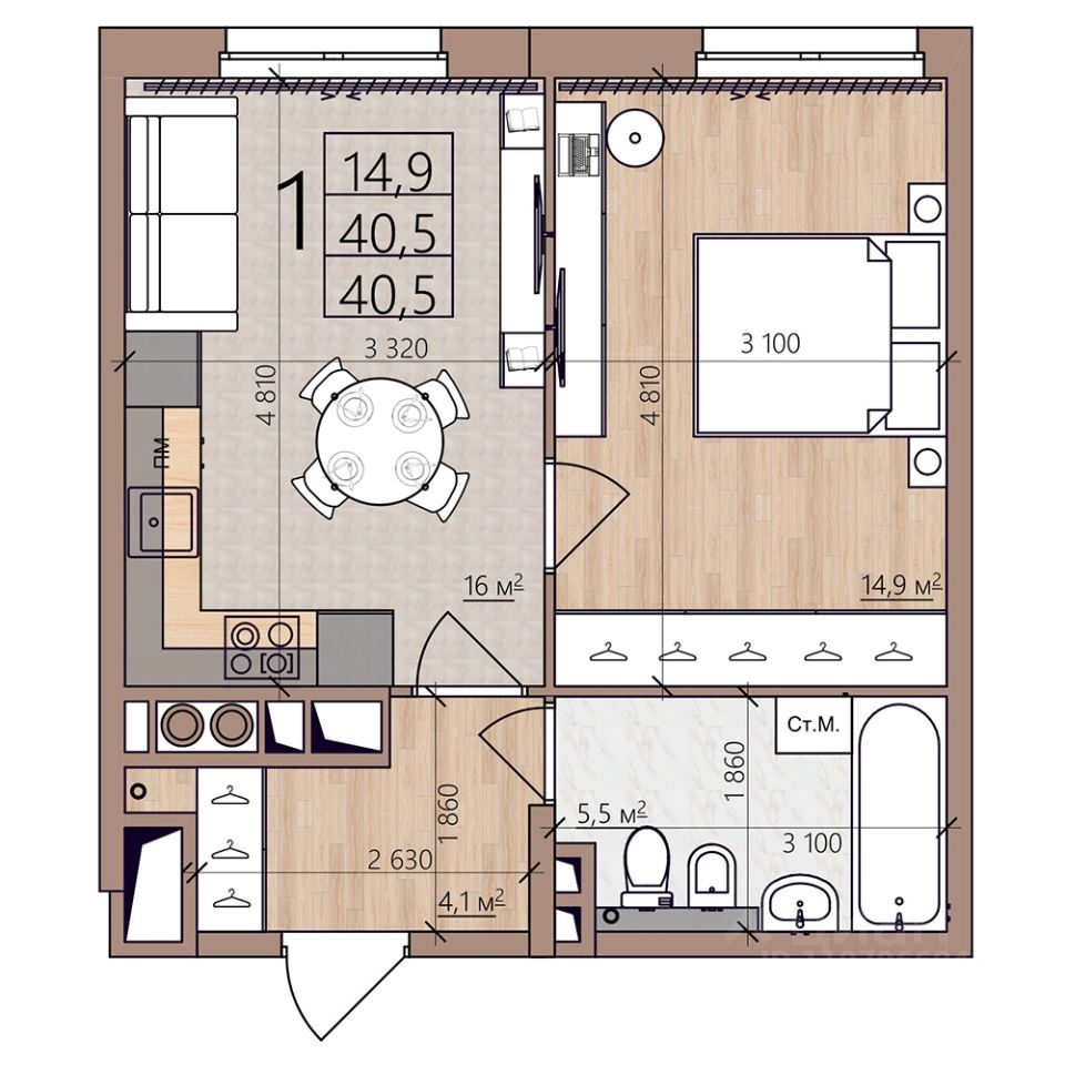 Общая площадь40,5 м²