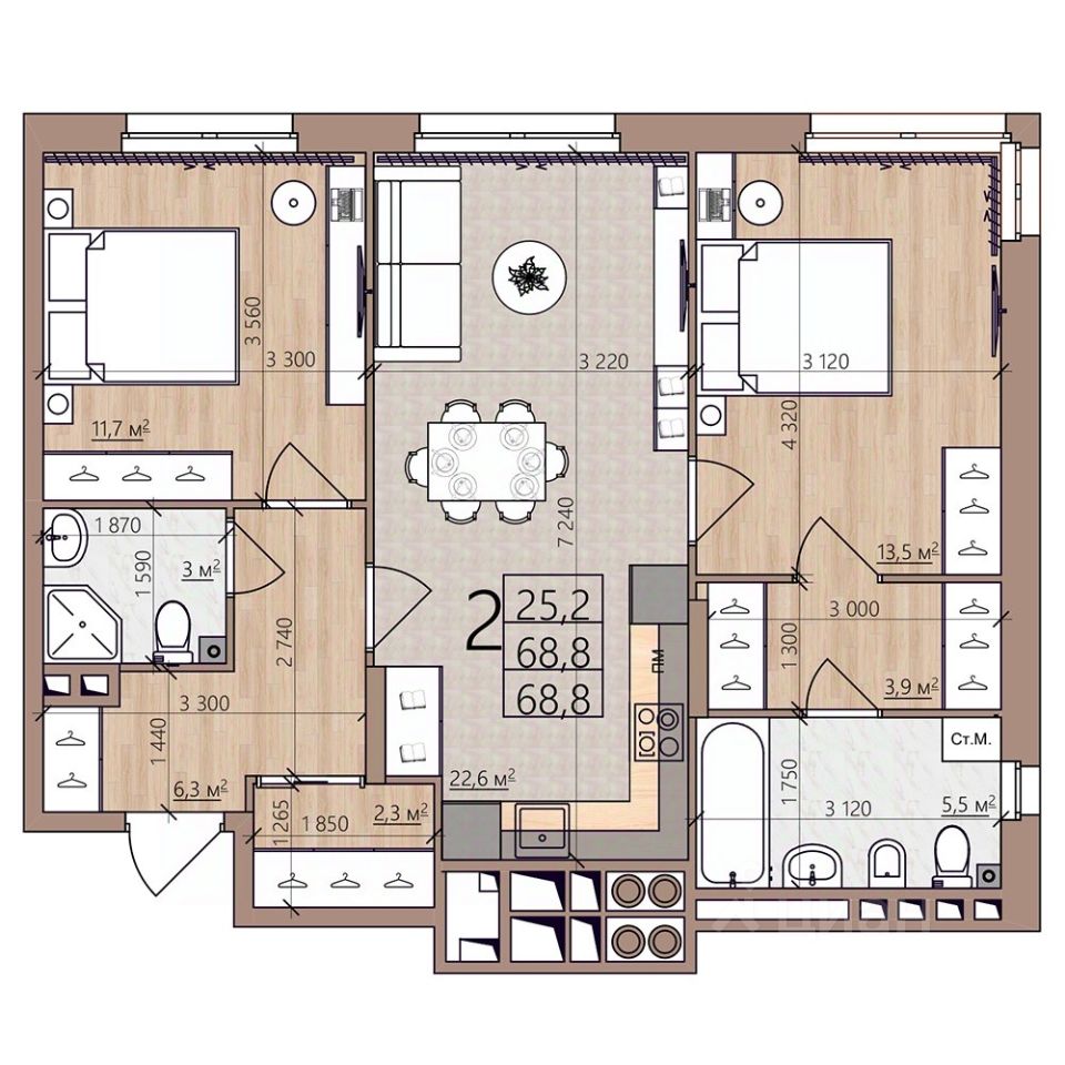 Общая площадь68,8 м²