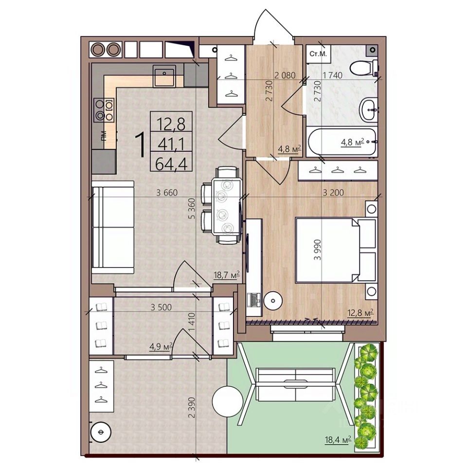Общая площадь64,4 м²
