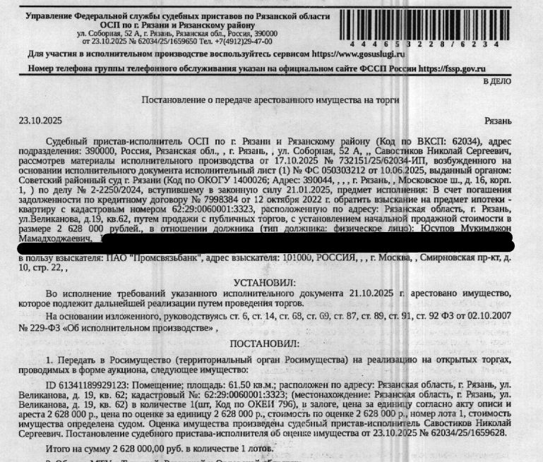Помещение, назначение: жилое, наименование: квартира, площадь 61,5 кв.м., кадастровый номер 62:29:0060001:3323, местоположение: Рязанская область, г. Рязань, ул. Великанова, д. 19, кв. 62. Согласно справке ООО "Р-Энергия" от 29.10.2025 г. по данному адресу зарегистрировано 5 человек, задолженность по взносам на капитальный ремонт составляет 24 778,52 руб. Залогодержатель: ПАО "Промсвязьбанк". Начальная цена: 2 628 000 (Два миллиона шестьсот двадцать восемь тысяч) руб. 00 коп., без НДС. Задаток: 130 000 (Сто тридцать тысяч) руб. 00 коп. Шаг аукциона 1%: 26 280 (Двадцать шесть тысяч двести восемьдесят) руб. 00 коп.