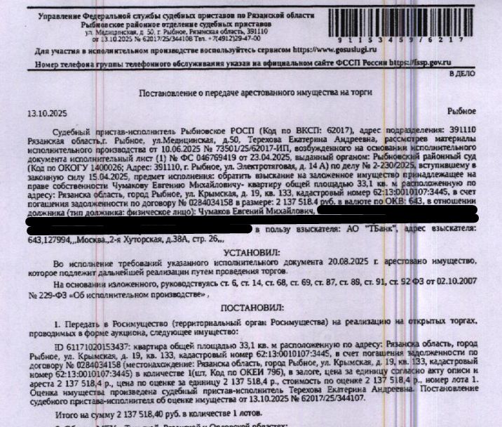 Помещение, назначение: жилое, наименование: квартира, площадь 33,1 кв.м., кадастровый номер 62:13:0010107:3445, адрес: Российская Федерация, Рязанская область, муниципальный район Рыбновский, городское поселение Рыбновское, город Рыбное, улица Крымская, дом 19, квартира 133. Согласно справке ООО "Р-Энергия" от 01.11.2025 г. по данному адресу зарегистрирован 1 человек, задолженность по взносам на капитальный ремонт составляет 408,12 руб. Залогодержатель: АО "Тинькофф Банк". Начальная цена: 2 137 518 (Два миллиона сто тридцать семь тысяч пятьсот восемнадцать) руб. 40 коп., без НДС. Задаток: 100 000 (Сто тысяч) руб. 00 коп. Шаг аукциона 1%: 21 375 (Двадцать одна тысяча триста семьдесят пять) руб. 18 коп.