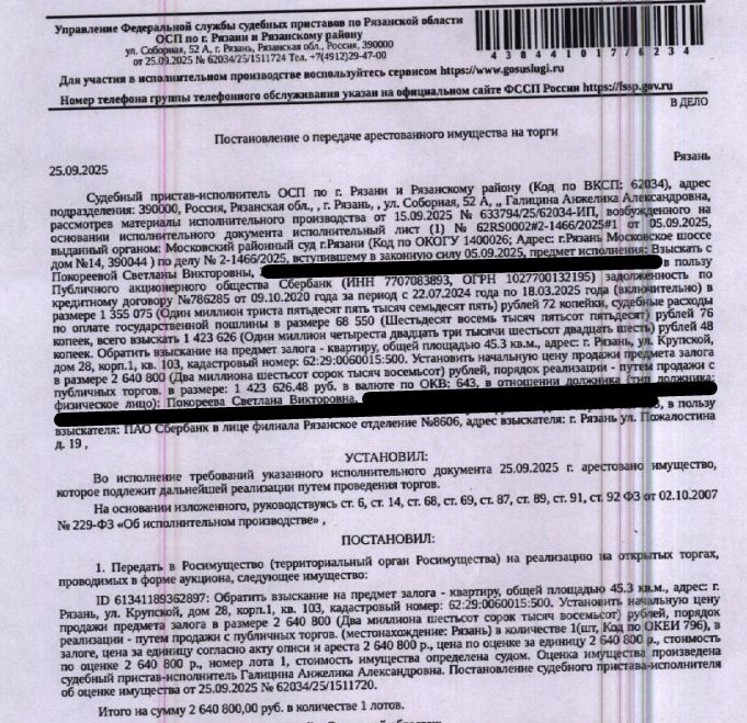 Помещение, назначение: жилое, наименование: квартира, площадь 45,3 кв.м., кадастровый номер 62:29:0060015:500, местоположение: г.Рязань, ул.Крупской, д.28 к.1, кв.103. Согласно справке ООО "Р-Энергия" от 30.10.2025 г. по данному адресу зарегистрировано 4 человека, задолженность по взносам на капитальный ремонт составляет 27 422,86 руб. Залогодержатель: ПАО "Сбербанк России". Начальная цена: 2 640 800 (Два миллиона шестьсот сорок тысяч восемьсот) руб. 00 коп., без НДС. Задаток: 130 000 (Сто тридцать тысяч) руб. 00 коп. Шаг аукциона 1%: 26 408 (Двадцать шесть тысяч четыреста восемь) руб. 00 коп.