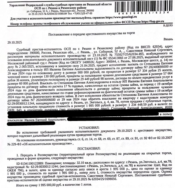Помещение, назначение: жилое, наименование: квартира, площадь 32,1 кв.м., кадастровый номер 62:29:0030012:1244, местоположение: г.Рязань, ул.Энгельса, д.4, кв.78. Согласно справке ООО "Р-Энергия" от 12.11.2025 г. по данному адресу зарегистрирован 1 человек, задолженность по взносам на капитальный ремонт составляет 41 879,76 руб. Взыскатель, в пользу которого обращено взыскание Ивлиев Е.А. Согласно выписке ЕГРН от 07.11.2025 имеются сведения о залоге имущества в пользу КПК "Партнер Финанс". Реализация имущества должника не лишает права залогодержателя на обращение взыскания на предмет залога. Начальная цена: 1 995 000 (Один миллион девятьсот девяносто пять тысяч) руб. 00 коп., без НДС. Задаток: 90 000 (Девяносто тысяч) руб. 00 коп. Шаг аукциона 1%: 19 950 (Девятнадцать тысяч девятьсот пятьдесят) руб. 00 коп.