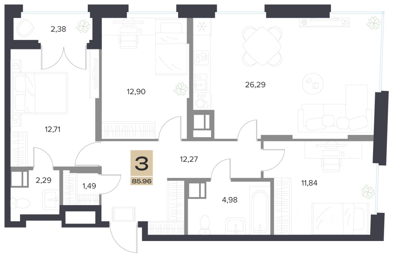 Продаётся 3-комнатная квартира в строящемся доме (Корпус 1), срок сдачи: IV-кв. 2028, общей площадью 85.96 кв.м., на 12 этаже. В мире, где все стремится вверх, мы переосмыслили понятие истинного комфорта.