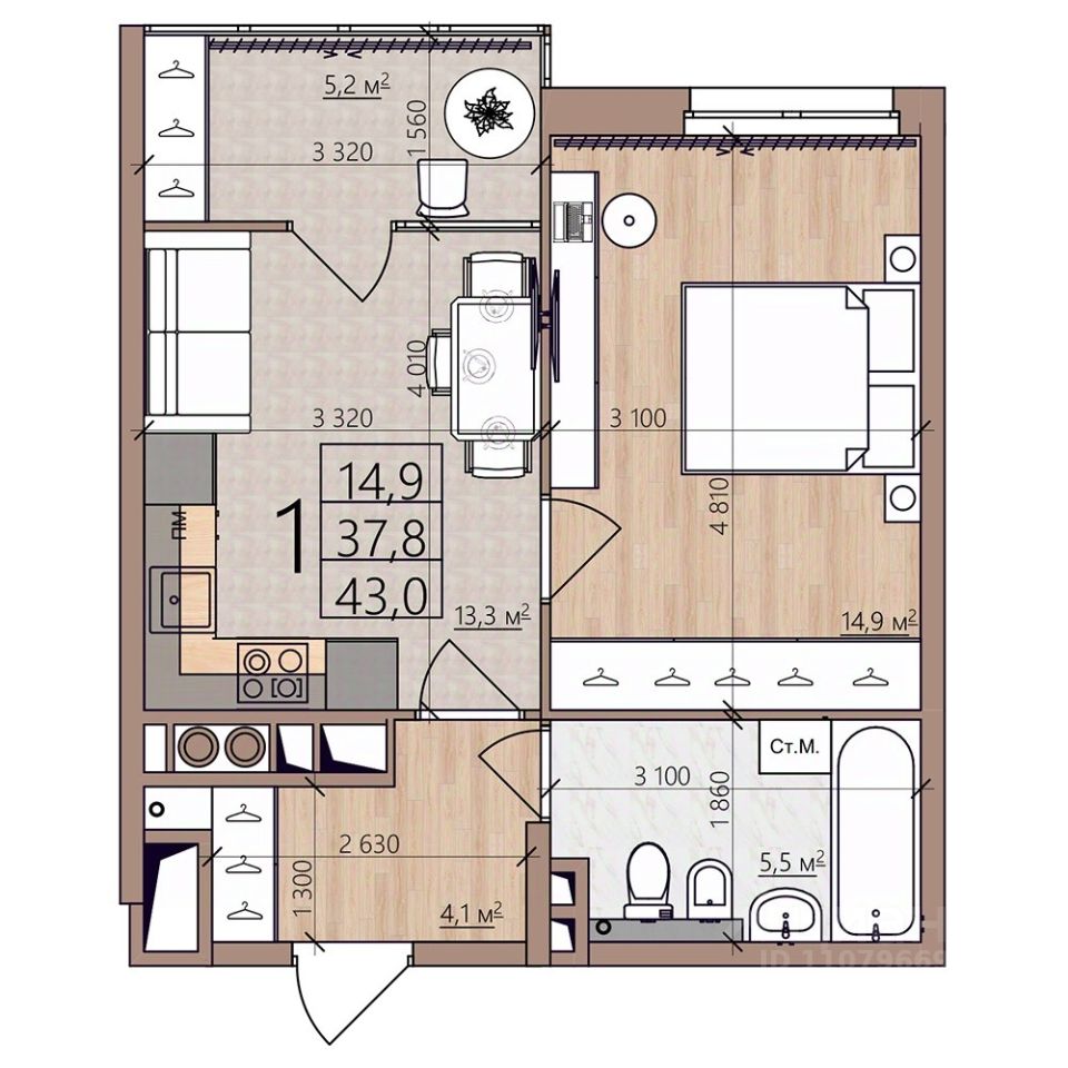 Общая площадь43 м²