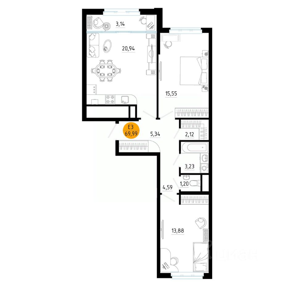 Общая площадь69,99 м²