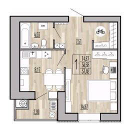 Уютная однокомнатная квартира площадью 37,48 кв.м Классическая планировка. Отдельная кухня с выходом на балкон и изолированной комнатой. В коридоре предусмотрено место под гардеробную.