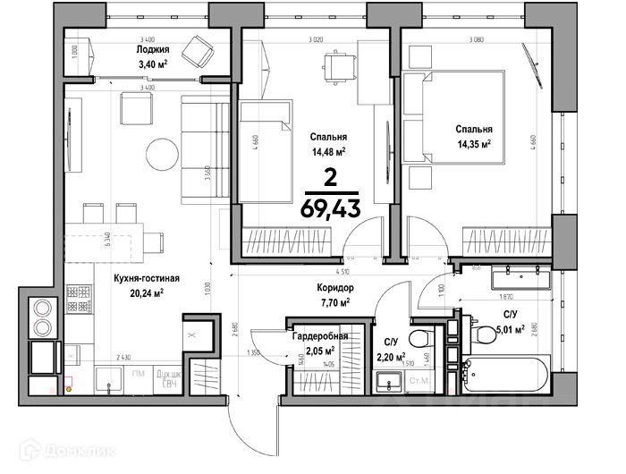 69,43 м²