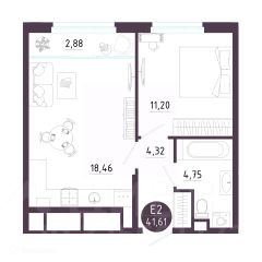 1 комн. квартира в ЖК Крылья, площадь 41.61 м², жилая 11.2 м², кухня 18.46 м²