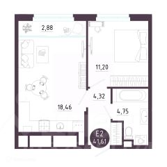 1 комн. квартира в ЖК Крылья, площадь 41.61 м², жилая 11.2 м², кухня 18.46 м²