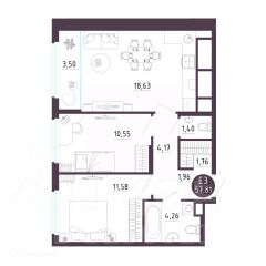 2 комн. квартира в ЖК Крылья, площадь 57.81 м², жилая 22.13 м², кухня 18.63 м²