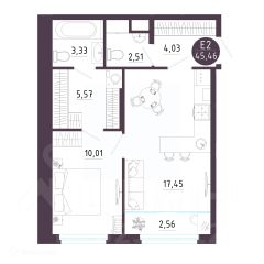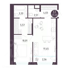 1 комн. квартира в ЖК Крылья, площадь 45.46 м², жилая 10.01 м², кухня 17.45 м²