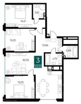 3 комн. квартира в ЖК Арт-кварталы, площадь 105.52 м², жилая 46.67 м², кухня 35.78 м²