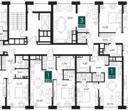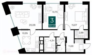 3 комн. квартира в ЖК Арт-кварталы, площадь 82.45 м², жилая 49.48 м², кухня 10.95 м²